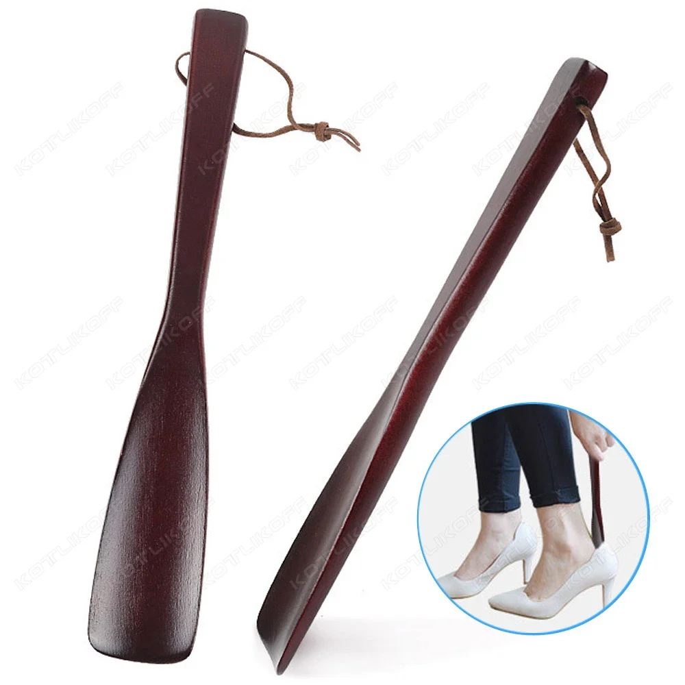 Chausse-pied en bois long, aidant à enfiler des chaussures élégantes et décontractées.